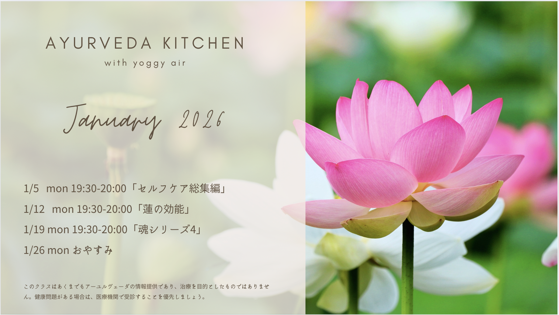 ※このクラスはあくまでもアーユルヴェーダの情報提供であり、治療を目的としたものではありません。健康問題がある場合は、医療機関で受診することを優先しましょう。
