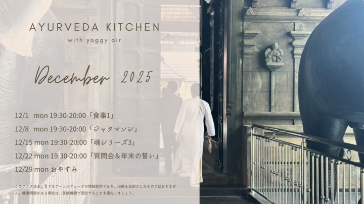 ※このクラスはあくまでもアーユルヴェーダの情報提供であり、治療を目的としたものではありません。健康問題がある場合は、医療機関で受診することを優先しましょう。