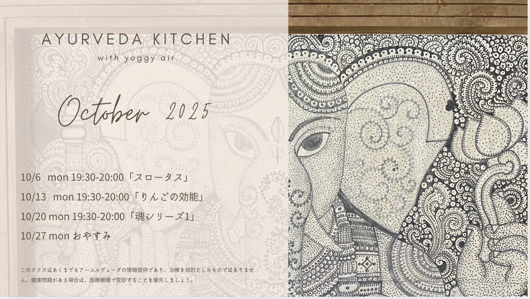 ※このクラスはあくまでもアーユルヴェーダの情報提供であり、治療を目的としたものではありません。健康問題がある場合は、医療機関で受診することを優先しましょう。