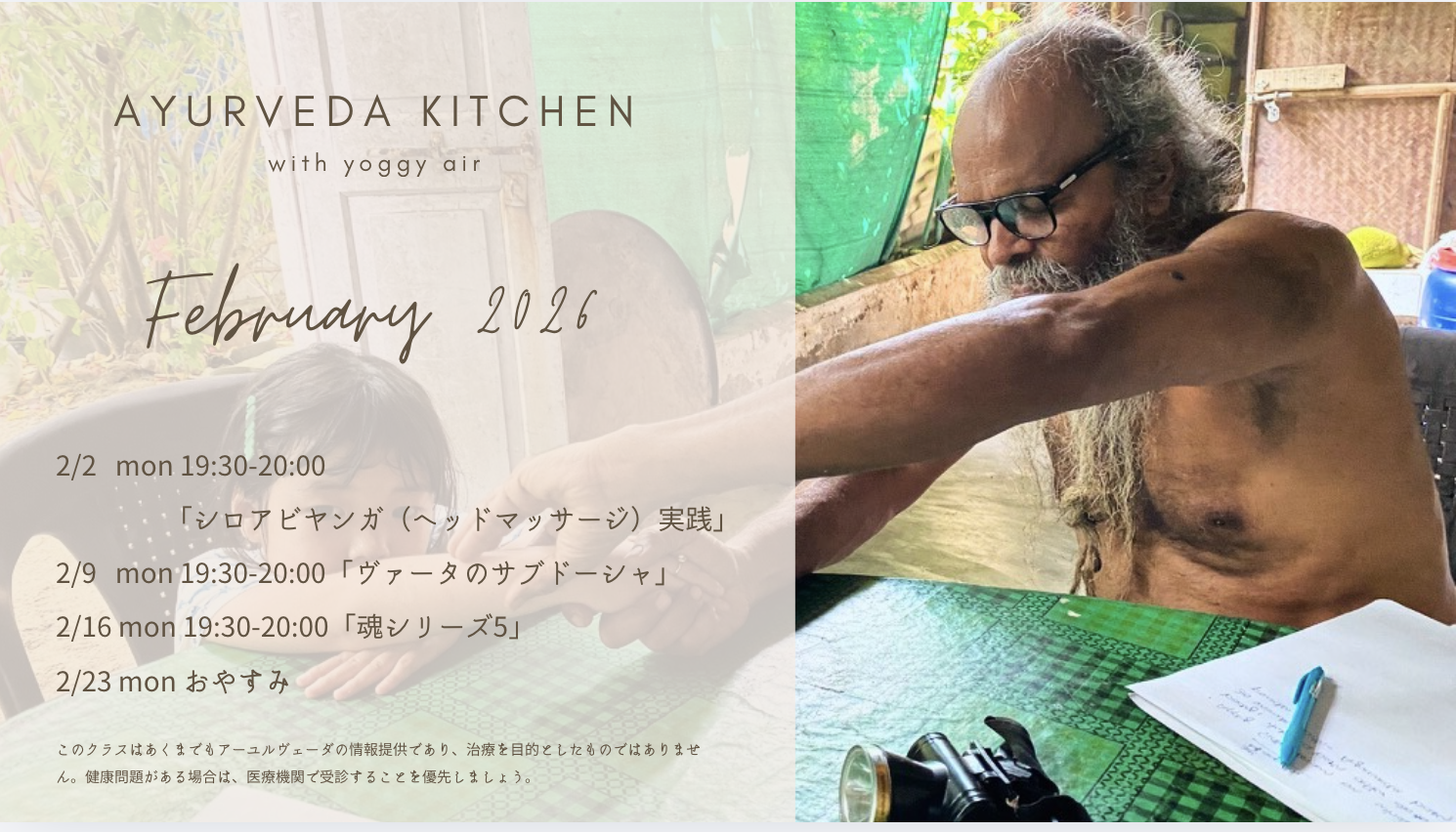 ※このクラスはあくまでもアーユルヴェーダの情報提供であり、治療を目的としたものではありません。健康問題がある場合は、医療機関で受診することを優先しましょう。
