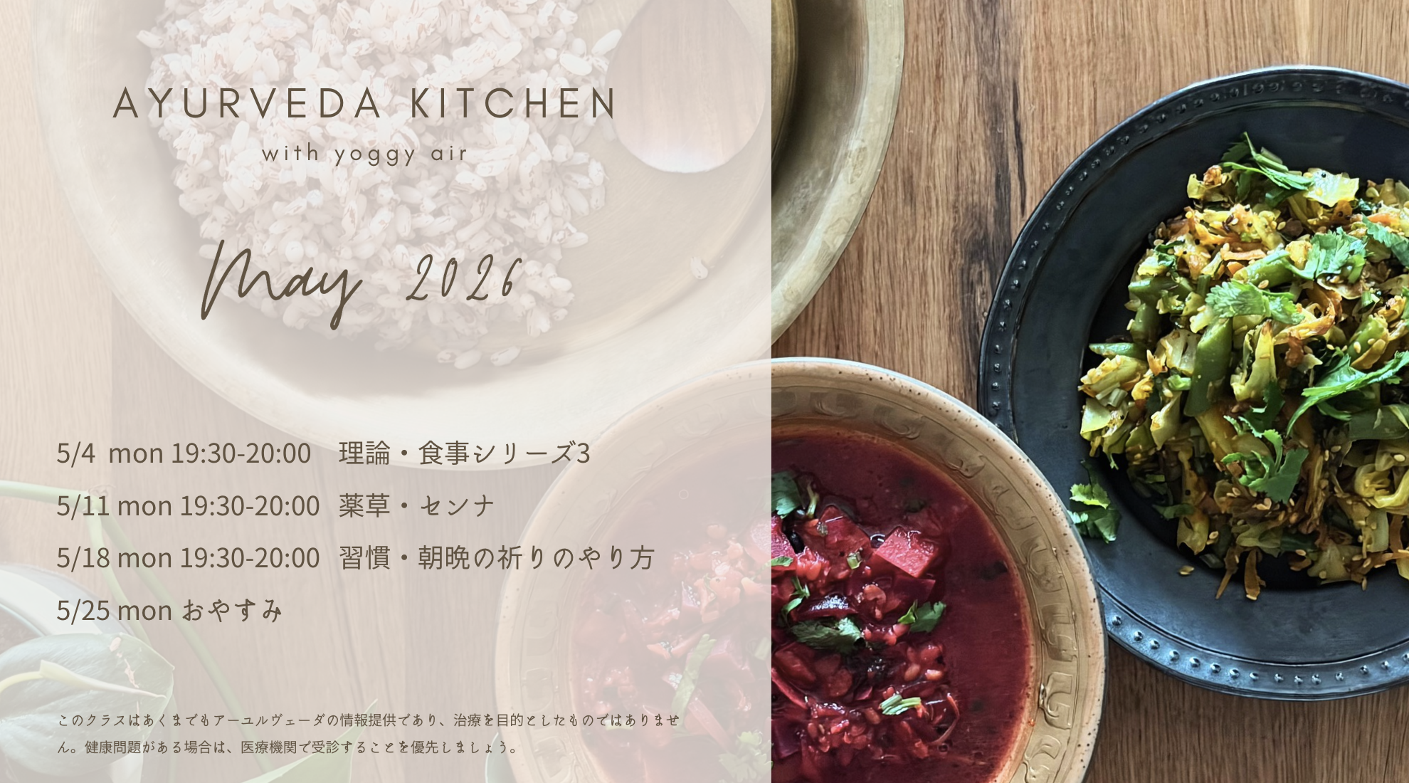 ※このクラスはあくまでもアーユルヴェーダの情報提供であり、治療を目的としたものではありません。健康問題がある場合は、医療機関で受診することを優先しましょう。